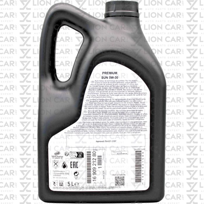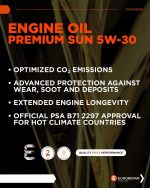 EUROREPAR PREMIUM SUN 5W-30 is also suited for gasoline and diesel engines requiring PSA B71 2290 and received the official PSA B71 2297 approval for hot climate countries
